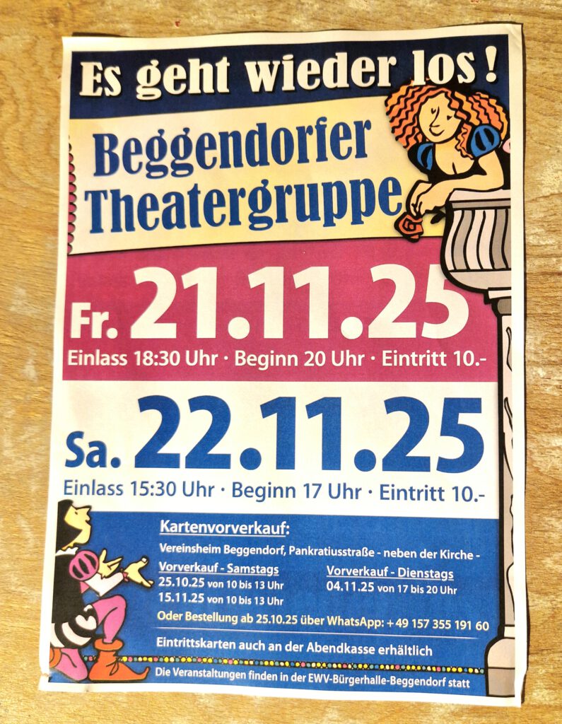Während sich die Kinder aus unserem Dorf auf das Martinsfest vorbereiten, Laternen basteln und Martinslieder einstudieren, laufen die Vorbereitungen bei den Frauen der Beggendorfer Theatergruppe seit Wochen auf Hochtouren. Bühnenbild, Kostüme, Texte, Lieder, alles muss stimmen, wenn sich der Vorhang für die Damen wieder hebt und die Lachmuskeln der Zuschauer in der EWV Bürgerhalle in Beggendorf auf die Probe gestellt werden. Sicher werden sich viele an die tollen Darbietungen aus etlichen Jahren und zuletzt aus dem vergangenen Jahr erinnern, bei denen kein Auge trocken blieb und so mancher Besucher, so manche Besucherin am nächsten Tag ein wenig Muskelkater im Bauch verspürte. Hier noch einmal das Programm aus 2024 und dann sind wir gespannt, was uns in 2025 erwartet …… Wer also noch keine Karte hat, der sollte sich beeilen ….