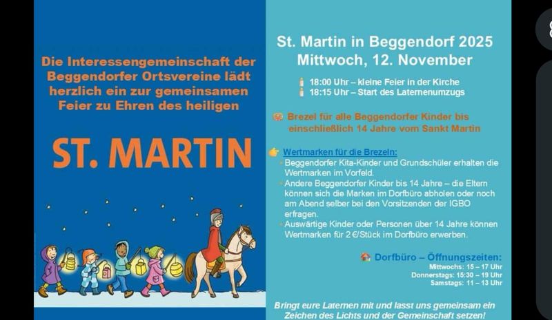 Noch ist unser Backes nicht winterfest gemacht, denn am 12. November feiert Beggendorf das St. Martin-Fest. Nach einer kleinen Feier, die um 18 Uhr in der Kirche stattfindet, zieht der Martinszug ab 18.30 Uhr durchs Dorf zum Feuer auf der Pfarrwiese. Am Backes teilt St. Martin dann die Martinsbrezeln aus. Mitglieder der Ortsvereine haben jetzt viele Brezelmarken in die Häuser gebracht. Wer jetzt noch Brezelmarken braucht, kann diese ab dem 2. November im Büro der Dorfwerkstatt in der Lindenstr. 10 zum Preis von 2 € erhalten. Öffnungszeiten: mittwochs: 15 bis 17 Uhr , donnerstags: 15.30 bis 19 Uhr, samstags: 11 bis 13 Uhr. Die Ortsvereine freuen sich, wenn an diesem Martinsabend 2024 auch in vielen Häusern wieder Lichter leuchten und so ein Zeichen sind für die Gemeinschaft in unserem Dorf.